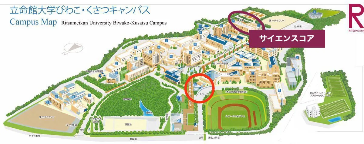 JR「南草津駅」東口から、近江鉄道バス「立命館大学行き」、または立命館大学経由「松ヶ丘五丁目」行き、「県立長寿社会福祉センター」行きに乗り、「立命館大学」で下車(約15分)
