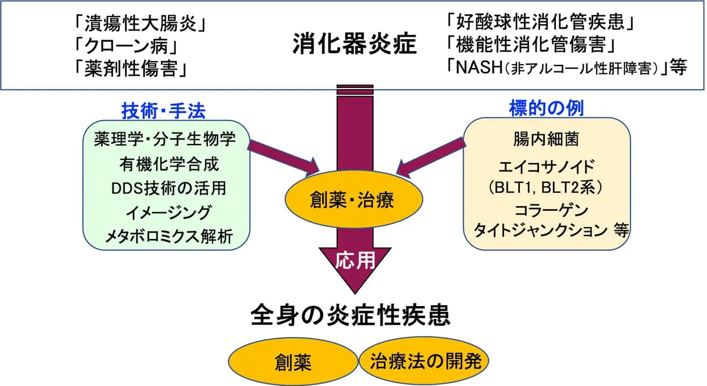 高齢化社会において汎用されている各種疾患に対する治療薬は、期待される主作用の反面、副作用として消化管粘膜に対する傷害性が問題視されている場合が少なくありません。そこで、消化管傷害などの副作用の少ないより安全かつ適切な薬物療法の提案を目指し、臨床で用いられる様々な薬剤による消化管傷害の病態解析をin vivoおよびin vitroの両面から行うと共に、予防ならびに治療法の提案を目指して研究を展開しています。
